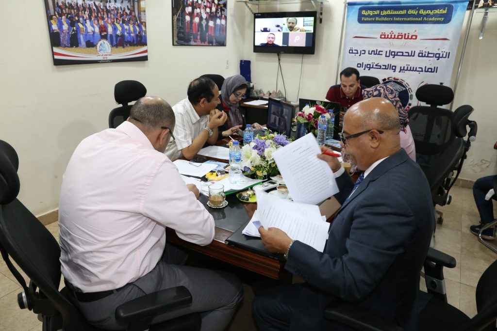 تجرى اليوم أكاديمية بناة المستقبل الدولية مناقشة حول محاور الرسالة العلمية للباحث ” عبدالفتاح علي حسين الشهاري ” مقدمة للحصول علي درجة الدكتوراه المهنية في تخصص (اعلام ) وذلك عبر الغرفة الألكترونية التى يحضر من خلالها الباحثيين من دول عربية مختلفة, حيث يأتى ذلك ضمن العام الدراسى (2019) لأكاديمية بناة المستقبل الدولية, والتى تم أنعقادها اليوم بتاريخ 7 من شهر يوليو فى تمام الساعة 10 صباحا بتوقيت القاهرة,وقام بالأشراف علي بحثه د/ مها فؤاد أستاذ ورئيس قسم العلوم الانسانية بأكاديمية بناة المستقبل الدولية وجريدة عالم التنمية