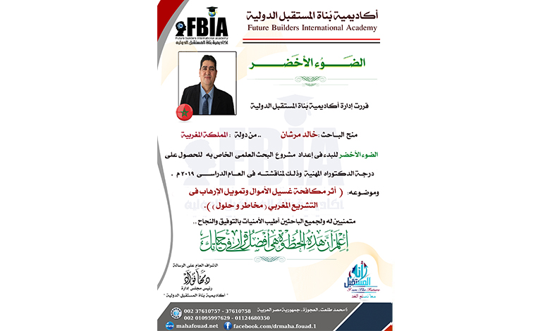 تفاعل الباحث مع فريق عمل الأكاديمية وقام بالتسجيل, وأنجز بحصوله على أكثر من دبلومة, والذى أعقبه الحصول على الضوء الأخضر بناءآ على قرار اللجنة #البحثية المشرفة على #الأبحاث العلمية بالأكاديمية, والذى يمثل شارة البدء #بالبحث_العلمى الذى اختار الباحث موضوعه وعنوانه للحصول على الدرجة المهنية, والذى يأتى تحت عنوان ” أثر مكافحة غسيل الأموال وتمويل الإرهاب فى التشريع المغربي ( مخاطر و حلول )”.