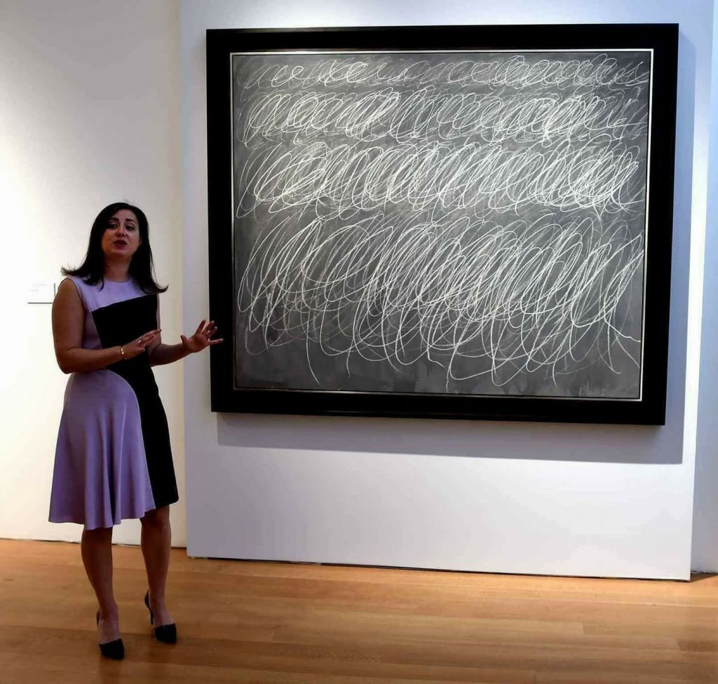 اللوحة عبارة عن ست سطور من خربشات دائرية بيضاء على لوحة رمادية !