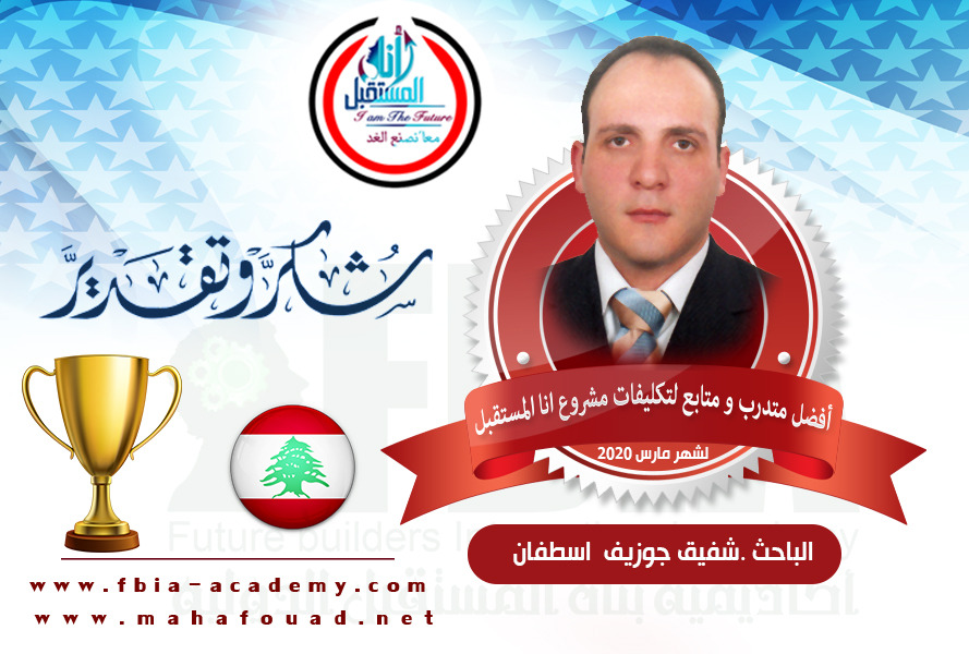 في سلسلة أفضل متدرب ومتابع لتكليفات مشروعات “اننا المستقبل في هذا الشهر منحت الدكتورة “مها فؤاد” أم المدربين العرب ومطورة الفكر الإنساني ورئيسة جريدة عالمل التنمية وأكاديمية بناة المستقبل الدولية، شهادة تقدير أفضل متدرب لشهر “مارس” الباحث ” شفيق جوزيف اسطفان ” من دولة لبنان، بعد اجتماع الدكتورة مها فؤاد وفريق عمل أكاديمية بناة المستقبل.