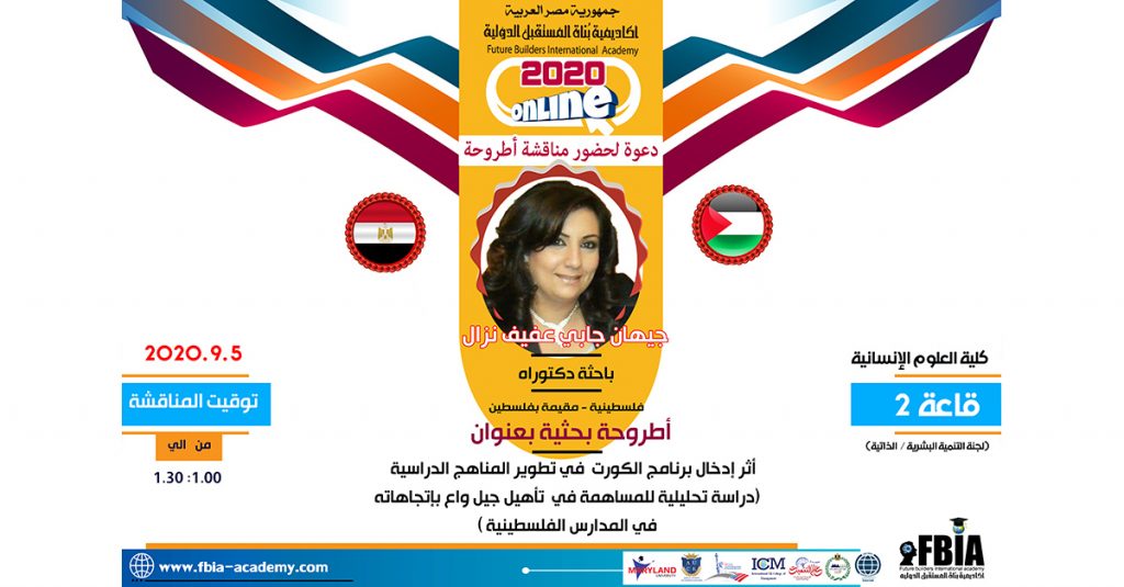 تتشرف اكاديمية #بناة_المستقبل الدولية #FBIA برئاسة الدكتورة “مها فؤاد” أم المدربين العرب ومطورة الفكر الإنساني ورئيسة جريدة عالم التنمية، بدعوة جميع الباحثيين وأصحاب العلم للمشاركة في الملتقي الدولي الحادي عشر للتدريب والتنمية بتاريخ ( 5 سبتمبر2020 )، لمناقشة الدراسة العلمية لباحثة الدكتوراه ” جيهان جابي عفيف نزال” فلسطينية مقيمة بفلسطين بكلية العلوم الإنسانية (لجنة التنمية البشرية / الذاتية ) عبر الغرفة الإلكترونية بالصوت والصورة بقاعة (2) ، تحت عنوان ” أثر إدخال برنامج الكورت في تطوير المناهج الدراسية (دراسة تحليلية للمساهمة في تأهيل جيل واع بإتجاهاته في المدارس الفلسطينية ) ” .