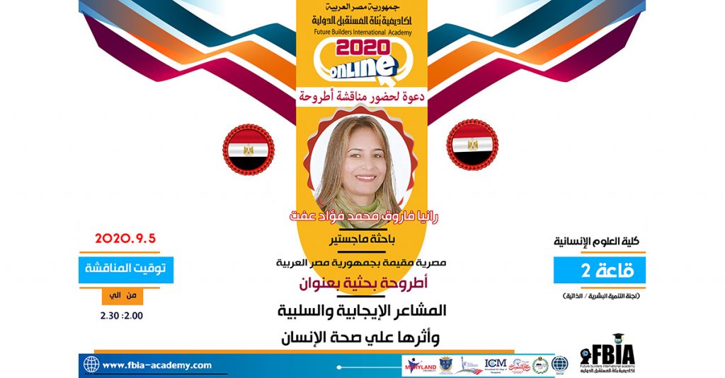 تتشرف اكاديمية #بناة_المستقبل الدولية #FBIA برئاسة الدكتورة “مها فؤاد” أم المدربين العرب ومطورة الفكر الإنساني ورئيسة جريدة عالم التنمية، بدعوة جميع الباحثيين وأصحاب العلم للمشاركة في الملتقي الدولي الحادي عشر للتدريب والتنمية بتاريخ ( 5 سبتمبر2020 )، لمناقشة الدراسة العلمية لباحثة الماجستير ” رانيا فاروق محمد فؤاد عفت” من جمهورية مصر العربية بكلية العلوم الإنسانية (لجنة التنمية البشرية / الذاتية ) عبر الغرفة الإلكترونية بالصوت والصورة بقاعة (2) ، تحت عنوان “المشاعر الإيجابية والسلبية وأثرها علي صحة الإنسان ” .