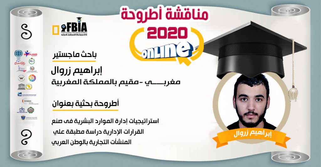 تشرفت اكاديمية #بناة_المستقبل الدولية #FBIA بحضور الدكاترة والباحثيين وأصحاب العلم لمناقشة الدراسة العلمية لباحث الماجستير “ إبراهيم زروال” من المملكة المغربية بكلية إدارة الأعمال (لجنة إدارة الأعمال /إدارة المشروعات)، تحت عنوان ” استراتيجيات إداره الموارد البشريه فى صنع القرارات الإداريه دراسه مطبقه علي المنشأت التجارية بالوطن العربي ” .