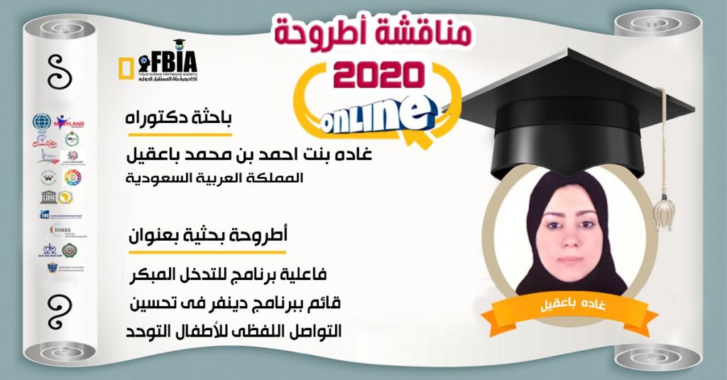 تناقش أكاديمية بناة المستقبل الدولية اليوم السبت الموافق 14 نوفمبر الباحثة “ غاده بنت احمد بن محمد باعقيل ” من المملكة العربية السعودية، مقدمة للحصول علي درجة الدكتوراة المهنية بعنوان ” فاعلية برامج للتدخل المبكر قائم ببرامج دينفر في تحسين التواصل اللفظي للأطفال التوحد “, حيث يأتى ذلك ضمن العام الدراسى (2020) لأكاديمية بناة المستقبل الدولية.