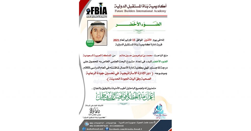 فى إطار ما تقدمة “أكاديمية بناة المستقبل الدولية” تحت قيادة الدكتورة ” #مهافؤاد ” مطورة الفكر الإنسانى ورئيس أكاديمية #بناة المستقبل الدولية وجريدة #عالم_التنمية, وما تطرحة من دبلومات فى مجال #إدارة_الأعمال والتنمية البشرية والعلوم الإنسانية الإرشادية ودرجات علمية للحصول على الماجستير والدكتوراة المهنية, تواصل الباحث/ محمد بن ابراهيم بن حسين هاشم من المملكة العربية السعودية مع الأكاديمية للحصول على درجة الماجستير المهني لعام 2021 من اكاديميه #بناة_المستقبل الدولية #FBIA.
