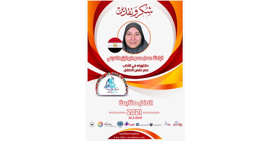 في سلسلة أفضل باحثيين لهذا الشهر منحت الدكتورة “مها فؤاد” أم المدربين العرب ومطورة الفكر الإنساني ورئيسة جريدة عالم التنمية وأكاديمية بناة المستقبل الدولية، شهادة تقدير أفضل متابعة لشهر ” مارس” 2021 للباحثة ” عمار محمود ابو اليزيد السرسى” من جمهورية مصر العربية ، عن موضوع بحثها ” أهمية الذكاء العاطفي و دوره في الحد من اضطراب القلق (دراسة تنبؤية)” ، بعد اجتماع الدكتورة مها فؤاد وفريق عمل أكاديمية بناة المستقبل.