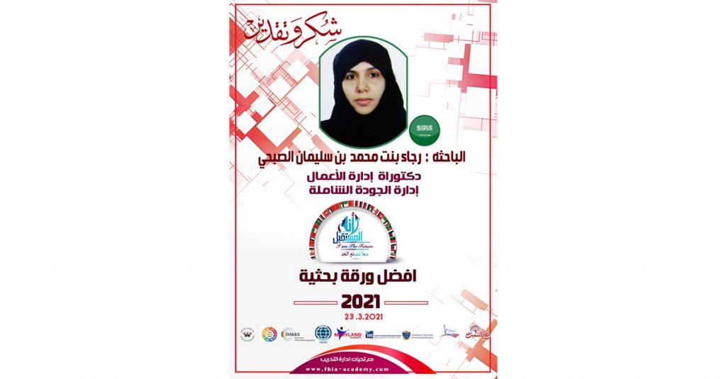 في سلسلة أفضل الأبحاث لهذا الشهر منحت الدكتورة “مها فؤاد” أم المدربين العرب ومطورة الفكر الإنساني ورئيسة جريدة عالم التنمية وأكاديمية بناة المستقبل الدولية، شهادة تقدير أفضل ورقة بحثية لشهر ” مارس” للباحثة ” رجاء بنت محمد بن سليمان الصبحي ” من المملكة العربية السعودية، عن موضوع بحثها ” الاستراتيجيات الحديثة للنهوض بتطبيقات الجودة الشاملة بالأنظمة والمراكز التدريبية (الكايزن -الكايكاكو) دراسة تطبيقية لبيان نتاجها على الأفراد ” ، بعد اجتماع الدكتورة مها فؤاد وفريق عمل أكاديمية بناة المستقبل.