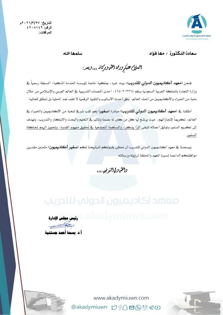 تقدم معهد أكاديميون الدولي للتدريب بجزيل الشكر لأكاديمية بناة المستقبل وللدكتورة الفاضلة مها فؤاد على تلك الرسالة الانسانية والحضارية التي تحملها في فتح أبواب المعرفة والتفكير العلمي أمام العقل لدى جميع آبناء وبنات الأمة العربية.