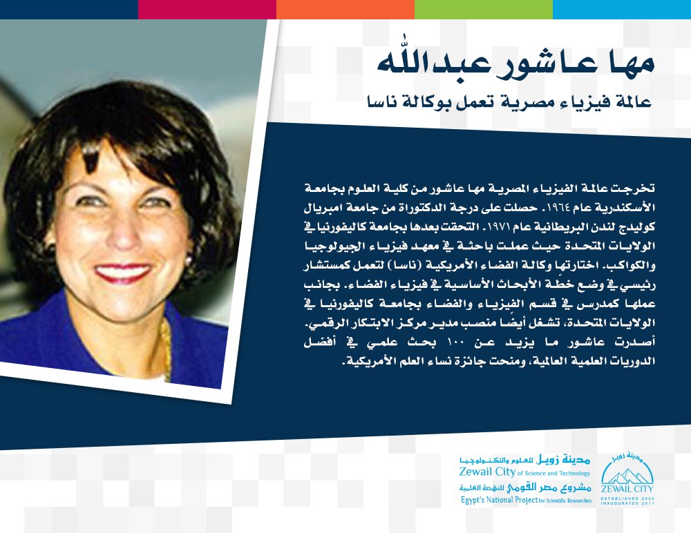 الدكتورة مها عاشور، وهى عالمة فيزياء مصرية عملت كأستاذة في علم الفيزياء بجامعة كاليفورنيا في لوس أنجلوس، وقد استطاعت الأسهام في وضع خطة الأبحاث الأساسية في فيزياء الفضاء بإدارة الطيران والفضاء الأمريكية (ناسا)، كونها أسهمت بما لا يقل عن 100 بحث علمي في مجال الفيزياء، كما حصلت على جائزة «نساء العلم» الأمريكية سنة 1990.
