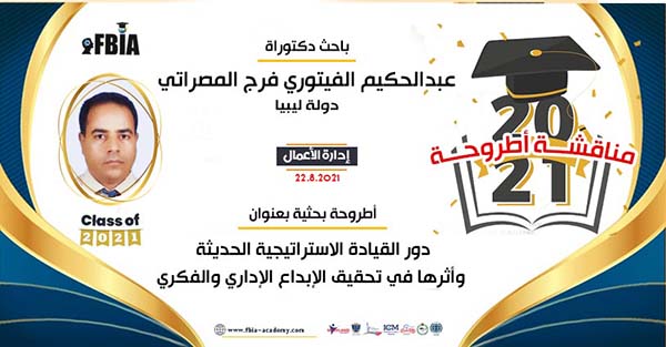 تشرفت اكاديمية #بناة_المستقبل الدولية #FBIA بحضور الدكاترة والباحثيين وأصحاب العلم والكوادر المتميزة في شتى المجالات العلمية المختلفة الملتقي الدولي الثاني عشر للتدريب والتنمية2021 تحت شعار (الاستراتيجيات الحديثة لإدارة المخاطر في مواجهة الأزمات العالمية) ، لمناقشة الدراسة العلمية لباحث الدكتوراه ” عبدالحكيم الفيتوري فرج المصراتي” من ليبيا بكلية إدارة الأعمال، تحت عنوان ” دور القيادة الاستراتيجية الحديثة وأثرها في تحقيق الإبداع الإداري والفكري“.