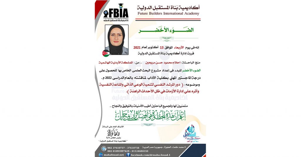 فى إطار ما تقدمة “أكاديمية بناة المستقبل الدولية” تحت قيادة الدكتورة ” #مهافؤاد ” مطورة الفكر الإنسانى ورئيس أكاديمية #بناة المستقبل الدولية وجريدة #عالم_التنمية, وما تطرحة من دبلومات فى مجال #إدارة_الأعمال والتنمية البشرية والعلوم الإنسانية الإرشادية ودرجات علمية للحصول على الماجستير والدكتوراة المهنية, تواصلت الباحثة/ احلام محمود حسن مريحين من المملكة الأردنية الهاشمية للحصول على درجة الماجستير المهني بكلية الآداب لعام 2022 من اكاديمية #بناة_المستقبل الدولية #FBIA.