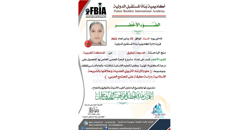 فى إطار ما تقدمة “أكاديمية بناة المستقبل الدولية” تحت قيادة الدكتورة ” #مهافؤاد ” مطورة الفكر الإنسانى ورئيس أكاديمية #بناة المستقبل الدولية وجريدة #عالم_التنمية, وما تطرحة من دبلومات فى مجال #إدارة_الأعمال والتنمية البشرية والعلوم الإنسانية الإرشادية ودرجات علمية للحصول على الماجستير والدكتوراة المهنية, تواصلت الباحثة/ خديجة توفيق من المملكة المغربية مع الأكاديمية للحصول على درجة الدكتوراة المهنية بكلية العلوم الانسانية لعام 2023 من اكاديمية #بناة_المستقبل الدولية #FBIA.
