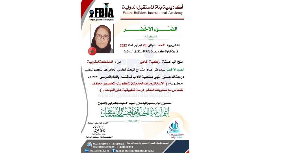 فى إطار ما تقدمة “أكاديمية بناة المستقبل الدولية” تحت قيادة الدكتورة ” #مهافؤاد ” مطورة الفكر الإنسانى ورئيس أكاديمية #بناة المستقبل الدولية وجريدة #عالم_التنمية, وما تطرحة من دبلومات فى مجال #إدارة_الأعمال والتنمية البشرية والعلوم الإنسانية الإرشادية ودرجات علمية للحصول على الماجستير والدكتوراة المهنية, تواصلت الباحثة/ زكية خافي من المملكة المغربية مع الأكاديمية للحصول على درجة الماجستير المهني بكلية الآداب لعام 2023 من اكاديمية #بناة_المستقبل الدولية #FBIA.