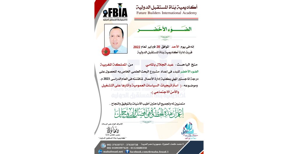 فى إطار ما تقدمة “أكاديمية بناة المستقبل الدولية” تحت قيادة الدكتورة ” #مهافؤاد ” مطورة الفكر الإنسانى ورئيس أكاديمية #بناة المستقبل الدولية وجريدة #عالم_التنمية, وما تطرحة من دبلومات فى مجال #إدارة_الأعمال والتنمية البشرية والعلوم الإنسانية الإرشادية ودرجات علمية للحصول على الماجستير والدكتوراة المهنية, تواصل الباحث/ عبد الجلال بالمامي من المملكة المغربية مع الأكاديمية للحصول على درجة الماجستير المهني تخصص إدارة الأعمال / العلوم السياسية لعام 2023 من اكاديميه #بناة_المستقبل الدولية #FBIA.