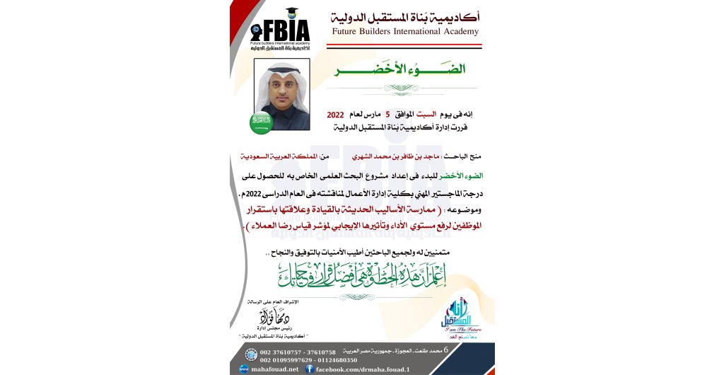فى إطار ما تقدمة “أكاديمية بناة المستقبل الدولية” تحت قيادة الدكتورة ” #مهافؤاد ” مطورة الفكر الإنسانى ورئيس أكاديمية #بناة المستقبل الدولية وجريدة #عالم_التنمية, وما تطرحة من دبلومات فى مجال #إدارة_الأعمال والتنمية البشرية والعلوم الإنسانية الإرشادية ودرجات علمية للحصول على الماجستير والدكتوراة المهنية والأستاذية, تواصل الباحث/ ماجد بن ظافر بن محمد الشهري من المملكة العربية السعودية مع الأكاديمية للحصول على درجة الماجستير المهني في إدارة الأعمال لعام 2023 من اكاديميه #بناة_المستقبل الدولية #FBIA.