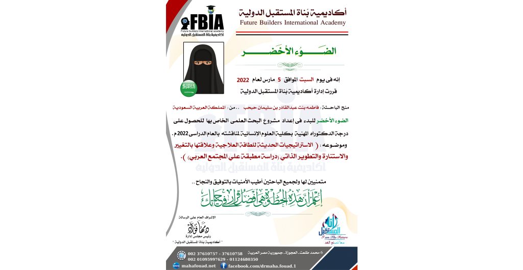 فى إطار ما تقدمة “أكاديمية بناة المستقبل الدولية” تحت قيادة الدكتورة ” #مهافؤاد ” مطورة الفكر الإنسانى ورئيس أكاديمية #بناة المستقبل الدولية وجريدة #عالم_التنمية, وما تطرحة من دبلومات فى مجال #إدارة_الأعمال والتنمية البشرية والعلوم الإنسانية الإرشادية ودرجات علمية للحصول على الماجستير والدكتوراة المهنية, تواصلت الباحثة/ فاطمه بنت عبدالقادر بن سليمان حبحب من المملكة العربية السعودية للحصول على درجة الدكتوراة المهنية بكلية العلوم الإنسانية / التنمية البشرية لعام 2022 من اكاديمية #بناة_المستقبل الدولية #FBIA.