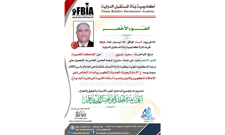 فى إطار ما تقدمة “أكاديمية بناة المستقبل الدولية” تحت قيادة الدكتورة ” #مهافؤاد ” مطورة الفكر الإنسانى ورئيس أكاديمية #بناة المستقبل الدولية وجريدة #عالم_التنمية, وما تطرحة من دبلومات فى مجال #إدارة_الأعمال والتنمية البشرية والعلوم الإنسانية الإرشادية ودرجات علمية للحصول على الماجستير والدكتوراة المهنية والأستاذية, تواصل الباحث/ سعيد لمريني من المملكة المغربية مع الأكاديمية للحصول على درجة الدكتوراة المنهية في إدارة الأعمال لعام 2023 من اكاديمية #بناة_المستقبل الدولية #FBIA .