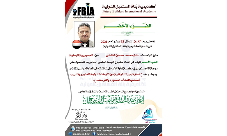 فى إطار ما تقدمة “أكاديمية بناة المستقبل الدولية” تحت قيادة الدكتورة ” #مهافؤاد ” مطورة الفكر الإنسانى ورئيس أكاديمية #بناة المستقبل الدولية وجريدة #عالم_التنمية, وما تطرحة من دبلومات فى مجال #إدارة_الأعمال والتنمية البشرية والعلوم الإنسانية الإرشادية ودرجات علمية للحصول على الماجستير والدكتوراة المهنية, تواصل الباحث/ عادل محمد محسن القاضي من جمهورية اليمنية مع الأكاديمية للحصول على درجة الماجستير المهني في كلية إدارة الأعمال لعام 2021 من اكاديميه #بناة_المستقبل الدولية #FBIA.