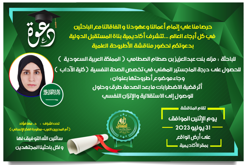 تتشرف أكاديمية بناة المستقبل الدولية FBIA – مصر ، فيوتشر بيلدرز انترناشيونال كومباني – الإمارات ، FBIA ACADEMY PRIVEE – المغرب ، وكلاء جامعة ميريلاند الأمريكية، بدعوتكم بمقر الأكاديمية بالقاهرة لحضور مناقشة أطروحة الماجستير للباحثة ” مزنه بنت عبدالعزيز بن صطام الصطامي ” – سعودية الجنسية ومقيمة بالمملكة العربية السعودية ، وجاءت الأطروحة بعنوان: أثر قضية الاضطرابات ما بعد الصدمة طرق وحلول للوصول إلى الاستقلالية والإتزان النفسي .