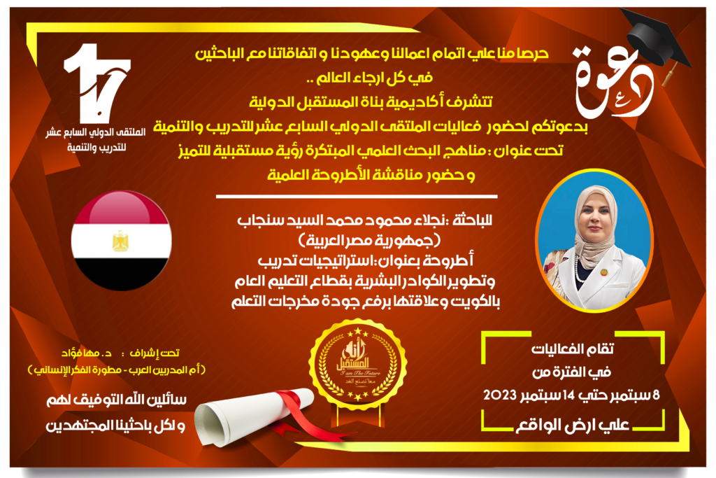لمناقشة الدراسة العلمية علي أرض الواقع ”بقاعة المؤتمرات الكبري بمركز التعليم المدني” ، لباحثة الدكتوراة ”نجلاء محمود محمد السيد سنجاب” من جمهورية مصر العربية (مقيمة بالكويت) في كلية إدارة الأعمال تخصص الإدارة التربوية – تحت عنوان ”استراتيجيات تدريب وتطوير الكوادر البشرية بقطاع التعليم العام بالكويت وعلاقتها برفع جودة مخرجات التعلم”.