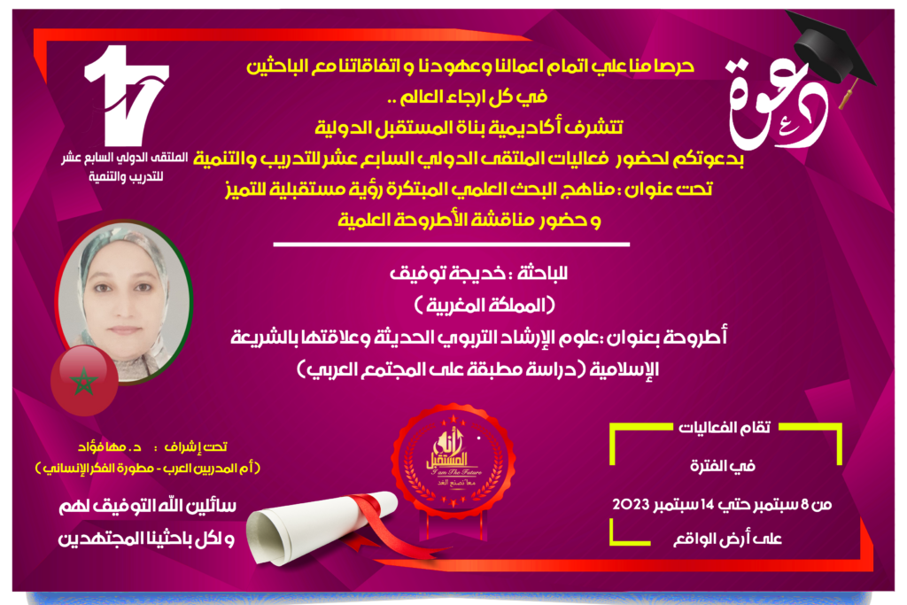 لمناقشة الدراسة العلمية علي أرض الواقع ”بقاعة المؤتمرات الكبري بمركز التعليم المدني” ، لباحثة الدكتوراة ”خديجة توفيق” من المملكة المغربية في كلية العلوم الإنسانية تخصص الإرشاد التربوي – تحت عنوان ”علوم الإرشاد التربوي الحديثة وعلاقتها بالشريعة الإسلامية (دراسة مطبقة على المجتمع العربي) ”.