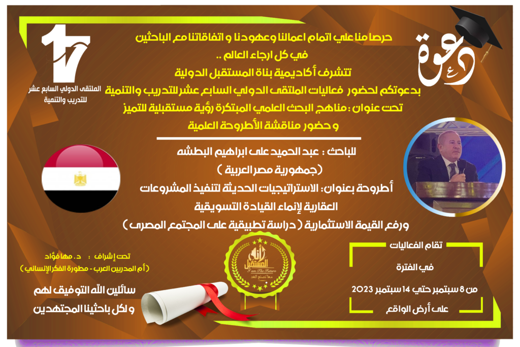 لمناقشة الدراسة العلمية علي أرض الواقع ”بقاعة المؤتمرات الكبري بمركز التعليم المدني” ، لباحث الدكتوراة ”عبد الحميد على ابراهيم البطشه” من جمهورية مصر العربية في كلية إدارة الأعمال تخصص إدارة المشروعات – تحت عنوان ”الاستراتيجيات الحديثة لتنفيذ المشروعات العقارية لإنماء القيادة التسويقية ورفع القيمة الاستثمارية ( دراسة تطبيقية على المجتمع المصرى )”.