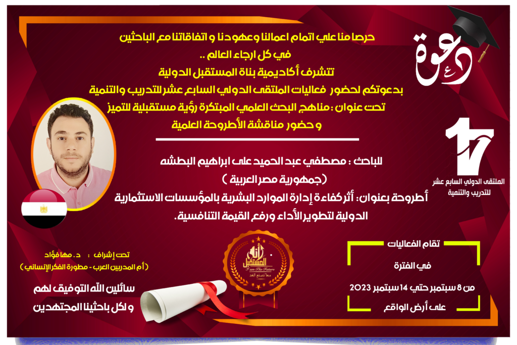 لمناقشة الدراسة العلمية علي أرض الواقع ” بقاعة المؤتمرات الكبري بمركز التعليم المدني”، لباحث الدكتوراة ”مصطفي عبد الحميد على ابراهيم البطشه” من جمهورية مصر العربية في إدارة الأعمال – تحت عنوان ”أثر كفاءة إدارة الموارد البشرية بالمؤسسات الاستثمارية الدولية لتطوير الأداء ورفع القيمة التنافسية” .