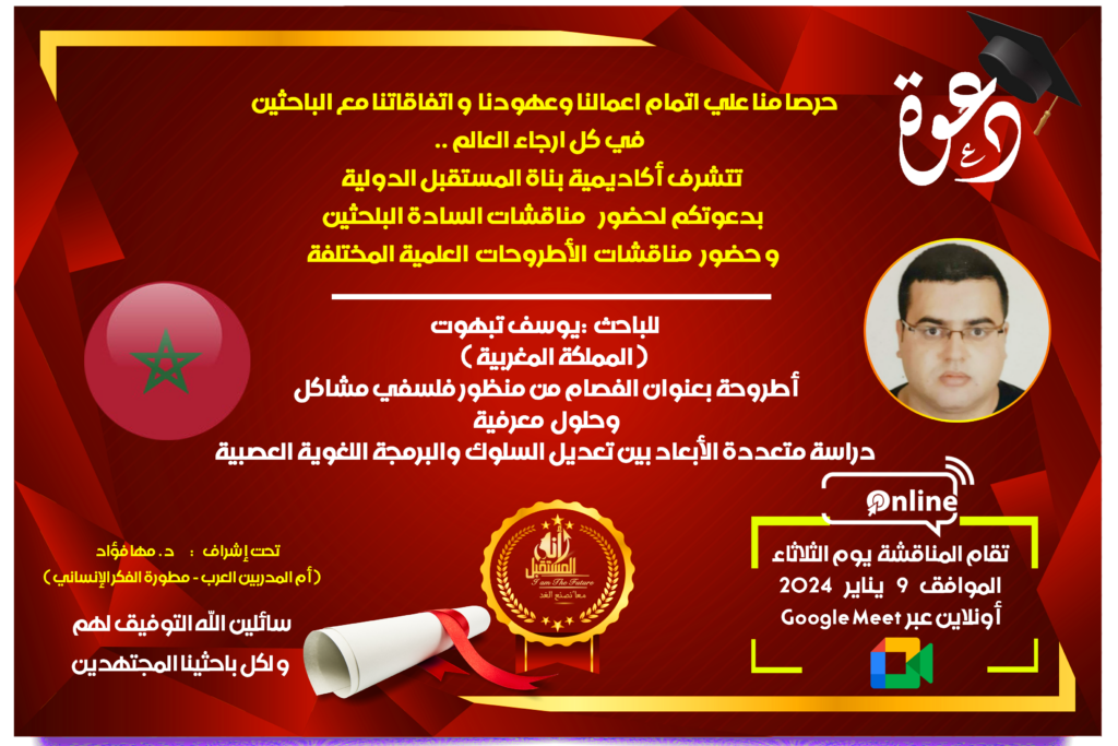 تتشرف أكاديمية بناة المستقبل الدولية FBIA – مصر ، فيوتشر بيلدرز انترناشيونال كومباني – الإمارات ، FBIA ACADEMY PRIVEE – المغرب ، وكلاء جامعة ميريلاند الأمريكية، بدعوتكم لحضور مناقشة أطروحة الدكتوراة عبر شبكة الإنترنت (Google Meet) عن بُعد بالصوت والصورة، لباحث الدكتوراة ” يوسف تبهوت “- من المملكة المغربية ، وجاءت الأطروحة بعنوان: الفصام من منظور فلسفي مشاكل وحلول معرفية دراسة متعددة الأبعاد بين تعديل السلوك والبرمجة اللغوية العصبية.