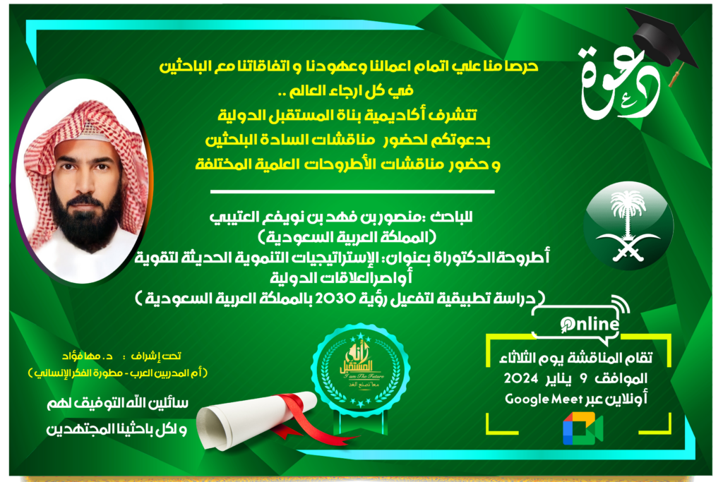 تتشرف أكاديمية بناة المستقبل الدولية FBIA – مصر ، فيوتشر بيلدرز انترناشيونال كومباني – الإمارات ، FBIA ACADEMY PRIVEE – المغرب ، وكلاء جامعة ميريلاند الأمريكية، بدعوتكم لحضور مناقشة أطروحة الدكتوراة عبر شبكة الإنترنت (Google Meet) عن بُعد بالصوت والصورة، لباحث الدكتوراة “ منصور بن فهد بن نويفع العتيبي “ من المملكة العربية السعودية،وجاءت الأطروحة بعنوان: الإستراتيجيات التنموية الحديثة لتقوية أواصرالعلاقات الدولية ( دراسة تطبيقية لتفعيل رؤية 2030 بالمملكة العربية السعودية )