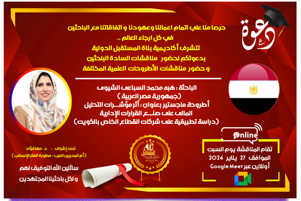 تتشرف أكاديمية بناة المستقبل الدولية FBIA – مصر ، فيوتشر بيلدرز انترناشيونال كومباني – الإمارات ، FBIA ACADEMY PRIVEE – المغرب ، وكلاء جامعة ميريلاند الأمريكية، بدعوتكم لحضور مناقشة أطروحة الدكتوراة عبر شبكة الإنترنت (Google Meet) عن بُعد بالصوت والصورة، لباحثة الماجستير “هبه محمد السباعى الشيوى “ من جمهورية مصر العربية مقيمة(بالكويت)،وجاءت الأطروحة بعنوان: أثر مؤشرات التحليل المالى على صنع القرارات الإدارية (دراسة تطبيقية على شركات القطاع الخاص بالكويت)