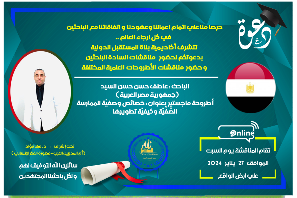 تتشرف أكاديمية بناة المستقبل الدولية FBIA – مصر ، فيوتشر بيلدرز انترناشيونال كومباني – الإمارات ، FBIA ACADEMY PRIVEE – المغرب ، وكلاء جامعة ميريلاند الأمريكية، بدعوتكم لحضور مناقشة أطروحة الدكتوراة عبر شبكة الإنترنت (Google Meet) عن بُعد بالصوت والصورة، لباحث الماجستير “عاطف حسن حسن السيد “ من جمهورية مصر العربية مقيم (بالكويت)،وجاءت الأطروحة بعنوان: خصائص وصفيّة للممارسة الصّفّيّة وكيفيّة تطويرها.