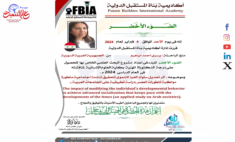تفاعلت الباحثة مع فريق عمل الأكاديمية وقامت بالتسجيل, وأنجزة بحصولها على أكثر من دبلومة, والذى أعقبه الحصول على الضوء الأخضر بناءًا على قرار اللجنة #البحثية المشرفة على #الأبحاث العلمية بالأكاديمية, والذى يمثل شارة البدء#بالبحث_العلمى الذى اختارة الباحثة موضوعه وعنوانه للحصول على الدرجة الدكتوراة المهنية، والذى يأتى تحت عنوان “أثر تعديل سلوك الفرد التنموى لتحقيق تنشئة اجتماعية متطورة مواكبة لتطورات العصر (دراسة تطبيقية على المجتمعات العربية )”.