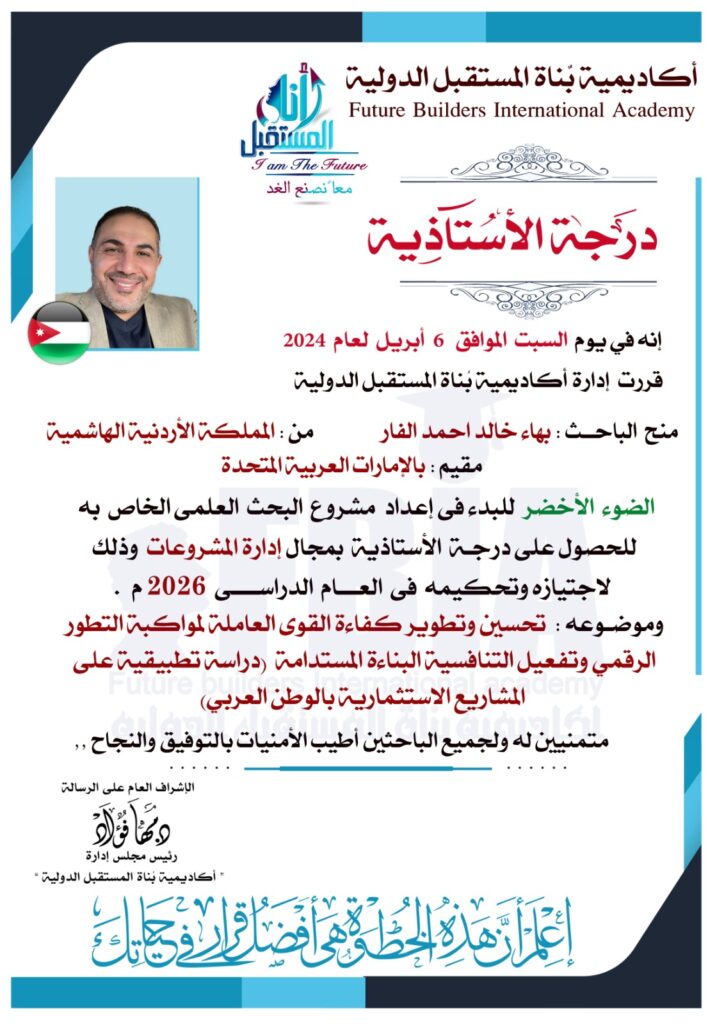 فى إطار ما تقدمه “أكاديمية بناة المستقبل الدولية” تحت قيادة الدكتورة ” #مها فؤاد ” مطورة الفكر الإنسانى ورئيس أكاديمية # بناة المستقبل الدولية وجريدة #عالم_التنمية، وما تطرحه من دبلومات فى مجال #إدارة_الأعمال والتنمية البشرية والعلوم الإنسانية الإرشادية ودرجات علمية للحصول على الماجستير والدكتوراة والاستاذية المهنية، تواصل الباحث الدكتور / بهاء خالد احمد الفار من المملكة الأردنية الهاشمية مقيم بدولة الإمارات العربية المتحدة مع الأكاديمية للحصول على درجة الاستاذية المهنية بمجال إدارة المشروعات لعام 2026 من أكاديمية #بناة_المستقبل الدولية #FBIA.