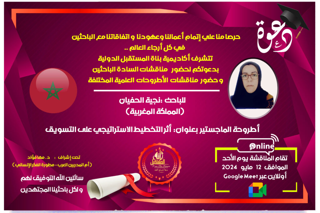 تتشرف أكاديمية بناة المستقبل الدولية FBIA – مصر ، فيوتشر بيلدرز انترناشيونال كومباني – الإمارات ، FBIA ACADEMY PRIVEE – المغرب ، وكلاء جامعة ميريلاند الأمريكية، بدعوتكم لحضور مناقشة أطروحة الماجستير عبر شبكة الإنترنت (Google Meet) عن بُعد بالصوت والصورة، لباحثة الماجستير “ نجية الحفيان “ من المملكة المغربية، وجاءت الأطروحة بعنوان: أثر التخطيط الاستراتيجي على التسويق.