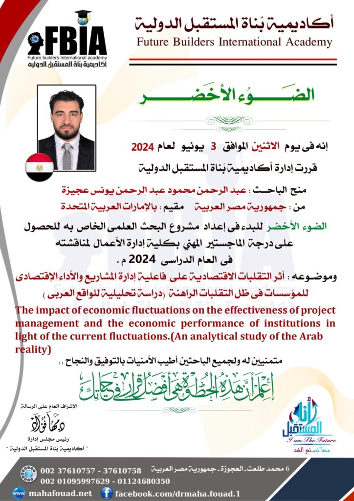 تفاعل الباحث مع فريق عمل الأكاديمية وقام بالتسجيل, وأنجز بحصوله على أكثر من دبلومة, والذى أعقبه الحصول على الضوء الأخضر بناءًا على قرار اللجنة #البحثية المشرفة على #الأبحاث العلمية بالأكاديمية, والذى يمثل شارة البدء #بالبحث_العلمى الذى اختار الباحث موضوعه وعنوانه للحصول على درجة الماجستير المهنية، والذى يأتى تحت عنوان “أثر التقلبات الاقتصادية على فاعلية إدارة المشاريع والأداء الإقتصادى للمؤسسات فى ظل التقلبات الراهنة (دراسة تحليلية للواقع العربى ) ”.