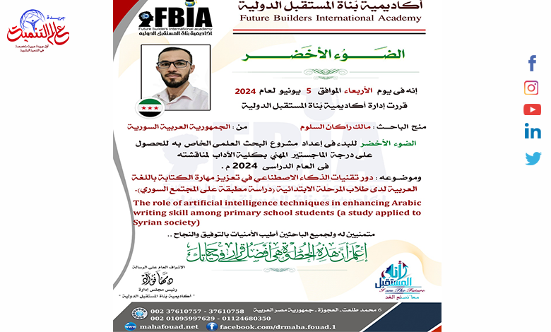 تفاعل الباحث مع فريق عمل الأكاديمية وقام بالتسجيل, وأنجز بحصوله على أكثر من دبلومة, والذى أعقبه الحصول على الضوء الأخضر بناءًا على قرار اللجنة #البحثية المشرفة على #الأبحاث العلمية بالأكاديمية, والذى يمثل شارة البدء #بالبحث_العلمى الذى اختار الباحث موضوعه وعنوانه للحصول على درجة الماجستير المهنية، والذى يأتى تحت عنوان “دور تقنيات الذكاء الاصطناعي في تعزيز مهارة الكتابة باللغة العربية لدى طلاب المرحلة الابتدائية (دراسة مطبقة على المجتمع السوري)”.