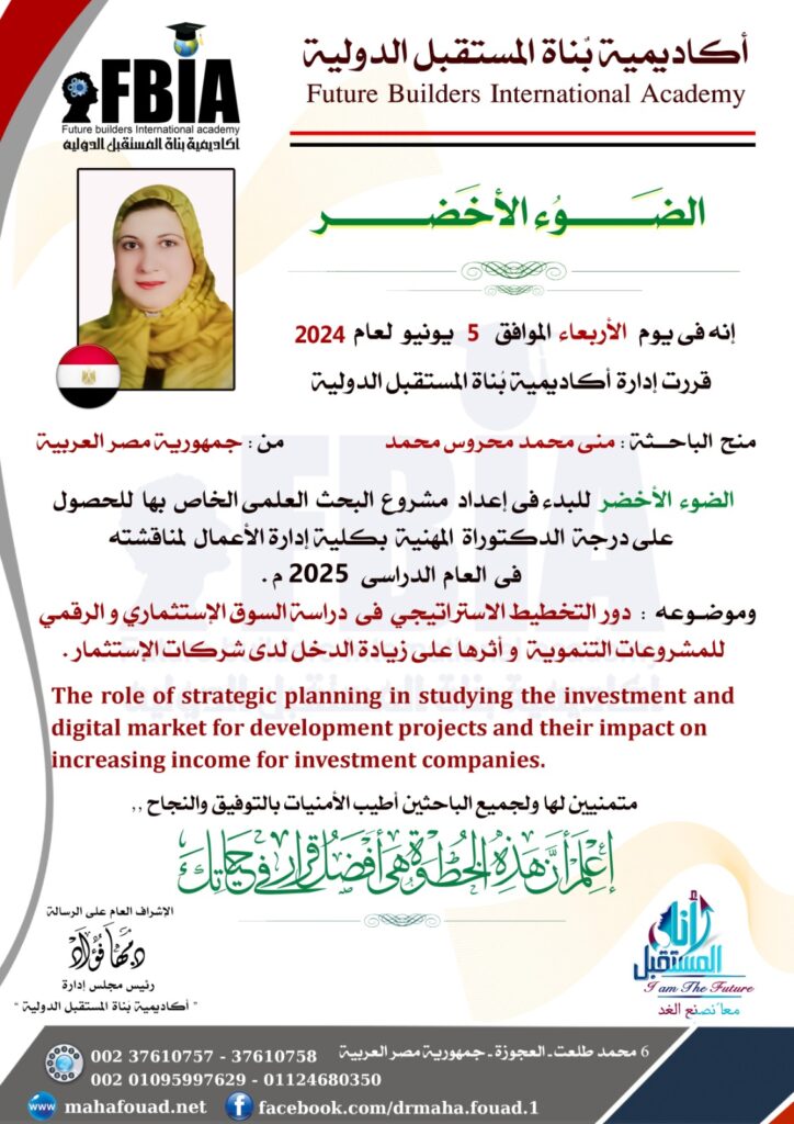 تفاعلت الباحثة مع فريق عمل الأكاديمية وقامت بالتسجيل, وأنجزة بحصولها على أكثر من دبلومة, والذى أعقبه الحصول على الضوء الأخضر بناءًا على قرار اللجنة #البحثية المشرفة على #الأبحاث العلمية بالأكاديمية, والذى يمثل شارة البدء#بالبحث_العلمى الذى اختارة الباحثة موضوعه وعنوانه للحصول على الدرجة الدكتوراة المهنية، والذى يأتى تحت عنوان “ أدور التخطيط الاستراتيجي فى دراسة السوق الإستثماري و الرقمي للمشروعات التنموية و أثرها على زيادة الدخل لدى شركات الإستثمار”.