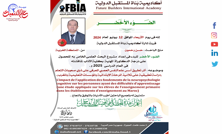 تفاعل الباحث مع فريق عمل الأكاديمية وقام بالتسجيل, وأنجز بحصوله على أكثر من دبلومة, والذى أعقبه الحصول على الضوء الأخضر بناءًا على قرار اللجنة #البحثية المشرفة على #الأبحاث العلمية بالأكاديمية, والذى يمثل شارة البدء #بالبحث_العلمى الذى اختار الباحث موضوعه وعنوانه للحصول على درجة الدكتورة المهنية، والذى يأتى تحت عنوان “أثر تطبيق أسس علم النفس العصبي المعرفي علي ذوي صعوبات التعلم (دراسة تطبيقية علي تلاميذ المرحلة الإبتدائية بالمؤسسات التعليمية بالمغرب)”.