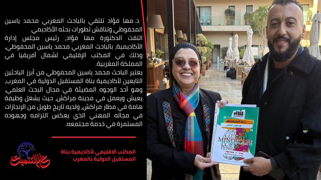 التقت الدكتورة مها فؤاد، رئيس مجلس إدارة الأكاديمية، بالباحث المغربي محمد ياسين المحفوظي، وذلك في المكتب الإقليمي لشمال أفريقيا في المملكة المغربية.