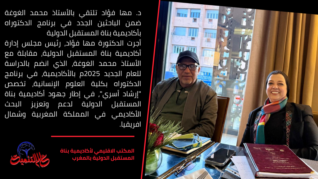 أجرت الدكتورة مها فؤاد، رئيس مجلس إدارة أكاديمية بناة المستقبل الدولية، مقابلة مع الأستاذ محمد الغوغة، الذي انضم بالدراسة للعام الجديد 2025م بالأكاديمية، في برنامج الدكتوراه بكلية العلوم الإنسانية، تخصص “إرشاد أسري”، في إطار جهود أكاديمية بناة المستقبل الدولية لدعم وتعزيز البحث الأكاديمي في المملكة المغربية وشمال افريقيا.