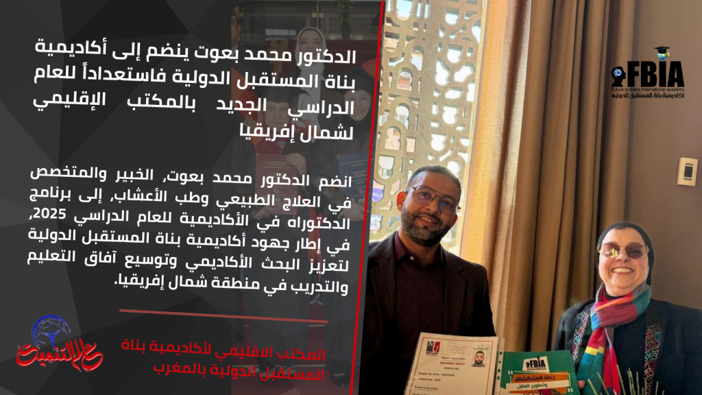 انضم الدكتور محمد بعوت، الخبير والمتخصص في العلاج الطبيعي وطب الأعشاب، إلى برنامج الدكتوراه في الأكاديمية للعام الدراسي 2025، في إطار جهود أكاديمية بناة المستقبل الدولية لتعزيز البحث الأكاديمي وتوسيع آفاق التعليم والتدريب في منطقة شمال إفريقيا.
