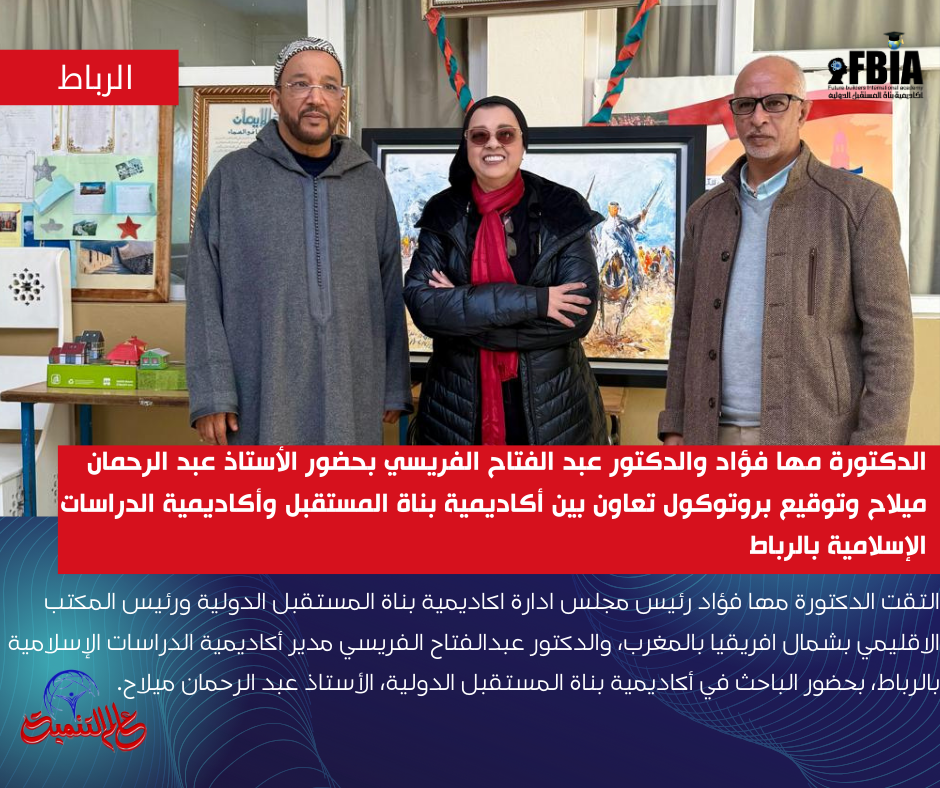 التقت الدكتورة مها فؤاد رئيس مجلس ادارة اكاديمية بناة المستقبل الدولية ورئيس المكتب الاقليمي بشمال افريقيا بالمغرب، والدكتور عبدالفتاح الفريسي مدير أكاديمية الدراسات الإسلامية بالرباط، بحضور الباحث في أكاديمية بناة المستقبل الدولية، الأستاذ عبد الرحمان ميلاح، في إطار تعزيز التعاون الأكاديمي الدولي، بالتعاون مع جامعة ميرلاند الأمريكية.