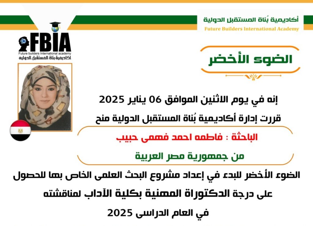 فاطمة أحمد فهمي حبيب تحصل على “الضوء الأخضر” للبحث في أكاديمية بناة المستقبل الدولية لنيل الدكتوراه المهنية