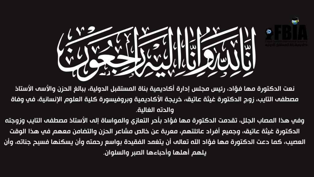نعت الدكتورة مها فؤاد، رئيس مجلس إدارة أكاديمية بناة المستقبل الدولية، ببالغ الحزن والأسى الأستاذ مصطفى التايب، زوج الدكتورة غيثة عاتيق، خريجة الأكاديمية وبروفيسورة العلوم الإنسانية، في وفاة والدته الغالية.
