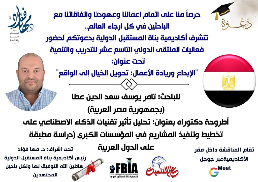 تتشرف أكاديمية بناة المستقبل الدولية FBIA – مصر ، فيوتشر بيلدرز انترناشيونال كومباني – الإمارات ، FBIA ACADEMY PRIVEE – المغرب ، وكلاء جامعة ميريلاند الأمريكية، بدعوتكم لحضور مناقشة أطروحة الدكتوراة عبر شبكة الإنترنت (Google Meet) عن بُعد بالصوت والصورة، لباحث الدكتوراه: تامر يوسف سعد الدين عطا، من جمهورية مصر العربية، وجاءت الأطروحة بعنوان: تحليل تأثير تقنيات الذكاء الاصطناعي على تخطيط وتنفيذ المشاريع في المؤسسات الكبرى (دراسة مطبقة على الدول العربية.