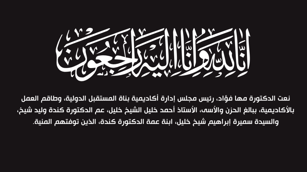 نعت الدكتورة مها فؤاد، رئيس مجلس إدارة أكاديمية بناة المستقبل الدولية، وطاقم العمل بالأكاديمية، ببالغ الحزن والأسى، الأستاذ أحمد خليل الشيخ خليل، عم الدكتورة كندة وليد شيخ، والسيدة سميرة إبراهيم شيخ خليل، ابنة عمة الدكتورة كندة، الذين توفتهم المنية.