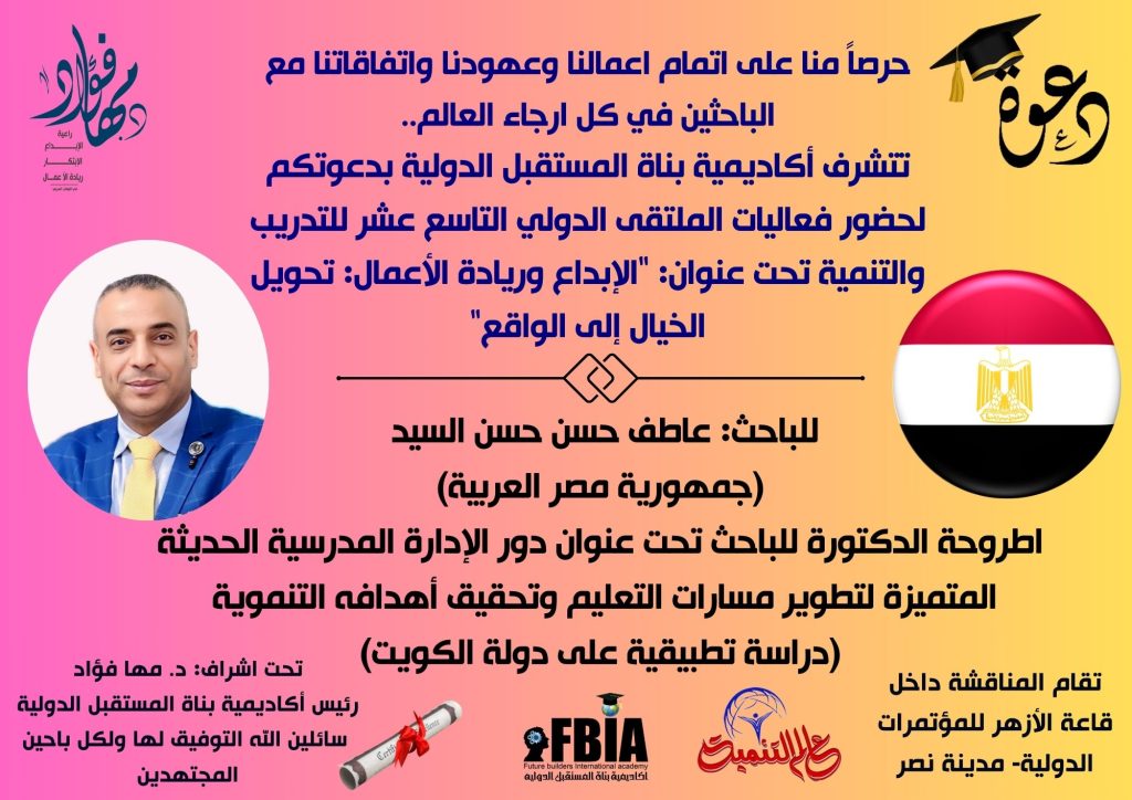 يعد الملتقى فرصة مميزة للتفاعل العلمي والمشاركة في تبادل الأفكار بين العلماء والباحثين من مختلف التخصصات، ومن أبرز فعاليات الملتقى، مناقشة أطروحة الباحث الدكتور عاطف حسن حسن السيد، من جمهورية مصر العربية والمقيم في الكويت، يوم السبت الموافق 18 يناير 2025 في قاعة الأزهر للمؤتمرات.
