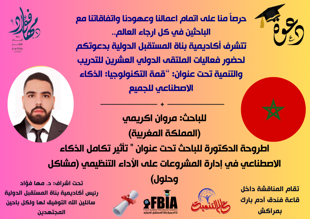 دعوة لحضور مناقشة أطروحة باحث الدكتوراه مروان أكريمي في الملتقى الدولي العشرون: “قمة التكنولوجيا: الذكاء الاصطناعي للجميع”