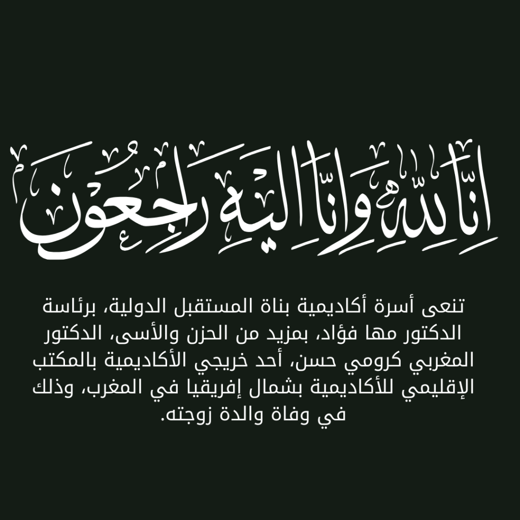 تتقدم أكاديمية بناة المستقبل الدولية بكامل التعازي والمواساة للدكتور كرومي حسن وعائلته الكريمة، داعيين الله العلي القدير أن يتغمد الفقيدة بواسع رحمته ويسكنها فسيح جناته، وأن يرزق أهلها وذويها الصبر والسلوان في هذه المناسبة الأليمة.