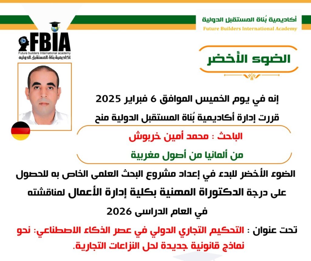 اختار الباحث محمد أمين خربوش موضوعًا ذا طابع علمي معاصر وهو التحكيم التجاري الدولي في عصر الذكاء الاصطناعي: نحو نماذج قانونية جديدة لحل النزاعات التجارية”، للحصول على درجة الدكتوراه المهني ، بكلية ادارة الاعمال لمناقشته في العام الدراسي 2026.